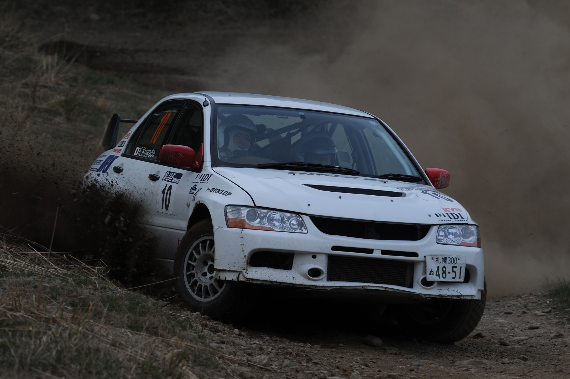 グラベルラリー3連戦の緒戦となる今回、注目のSS1イワタケⅠ(3.28km)を制したのは開幕戦優勝の勝田範彦インプレッサだ。その勝田から1.7秒遅れで柳澤宏至ランサーと桑田幸典ランサーが並び、さらに0.4秒遅れて奴田原文雄ランサーというオーダーだ。だが、SS1でベストタイムを叩き出したものの「スプリングを柔らかくしすぎたこともあるけど、それ以上に自分のドライビングに納得いっていない。フロントの入りが悪くて思うようにインを攻められず、逆にインを攻め過ぎて土手に乗り上げてアウト側に行ったりと、ぎこちない運転をしている」と勝田。その不安が的中しSS2安田Ⅰ(6.35km)では奴田原、桑田の後塵を浴び、SS3スキー場Ⅰ(1.21km)を終えた時点ではトップの奴田原から2.4秒差の3番手まで順位を下げた。