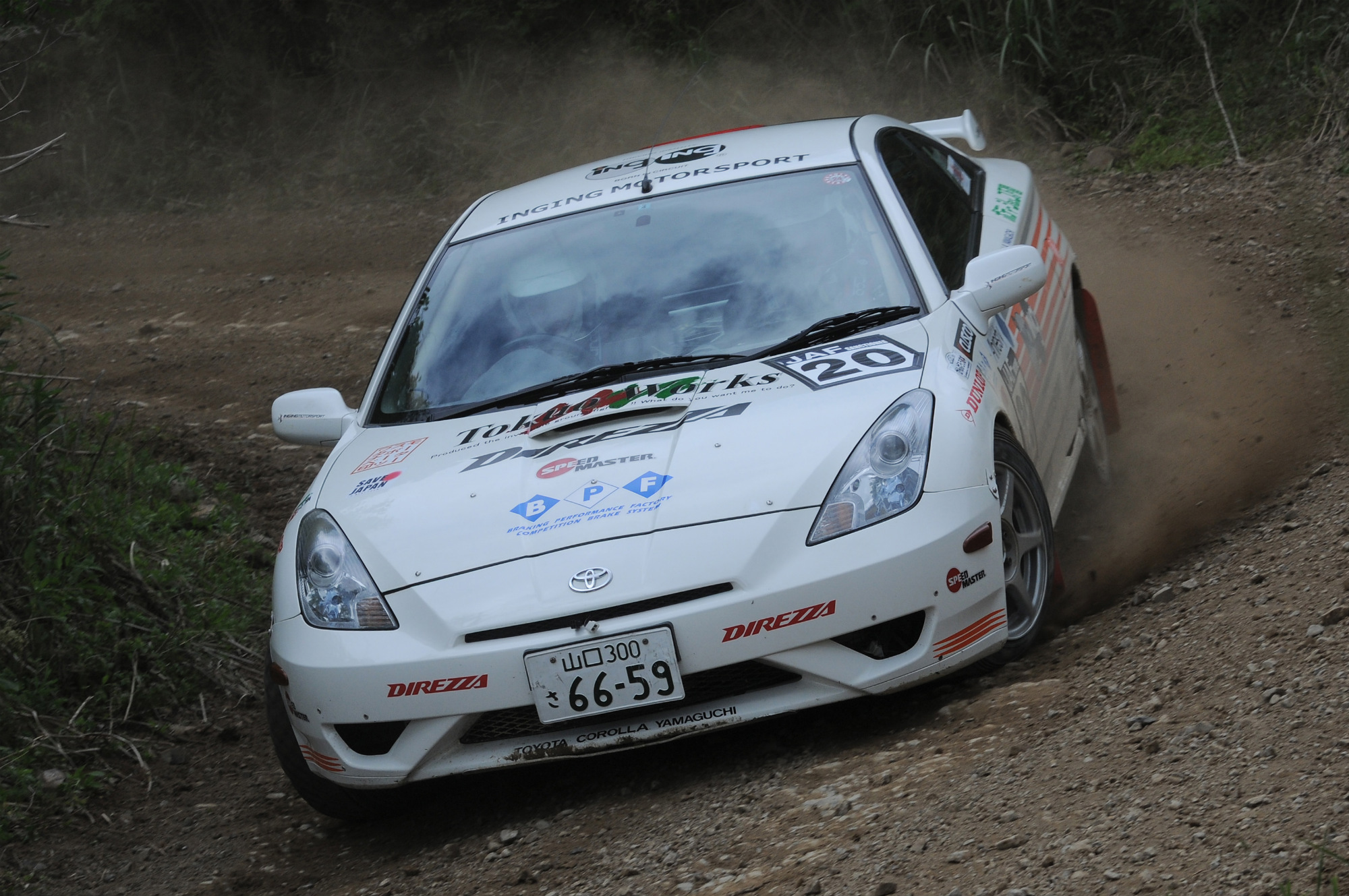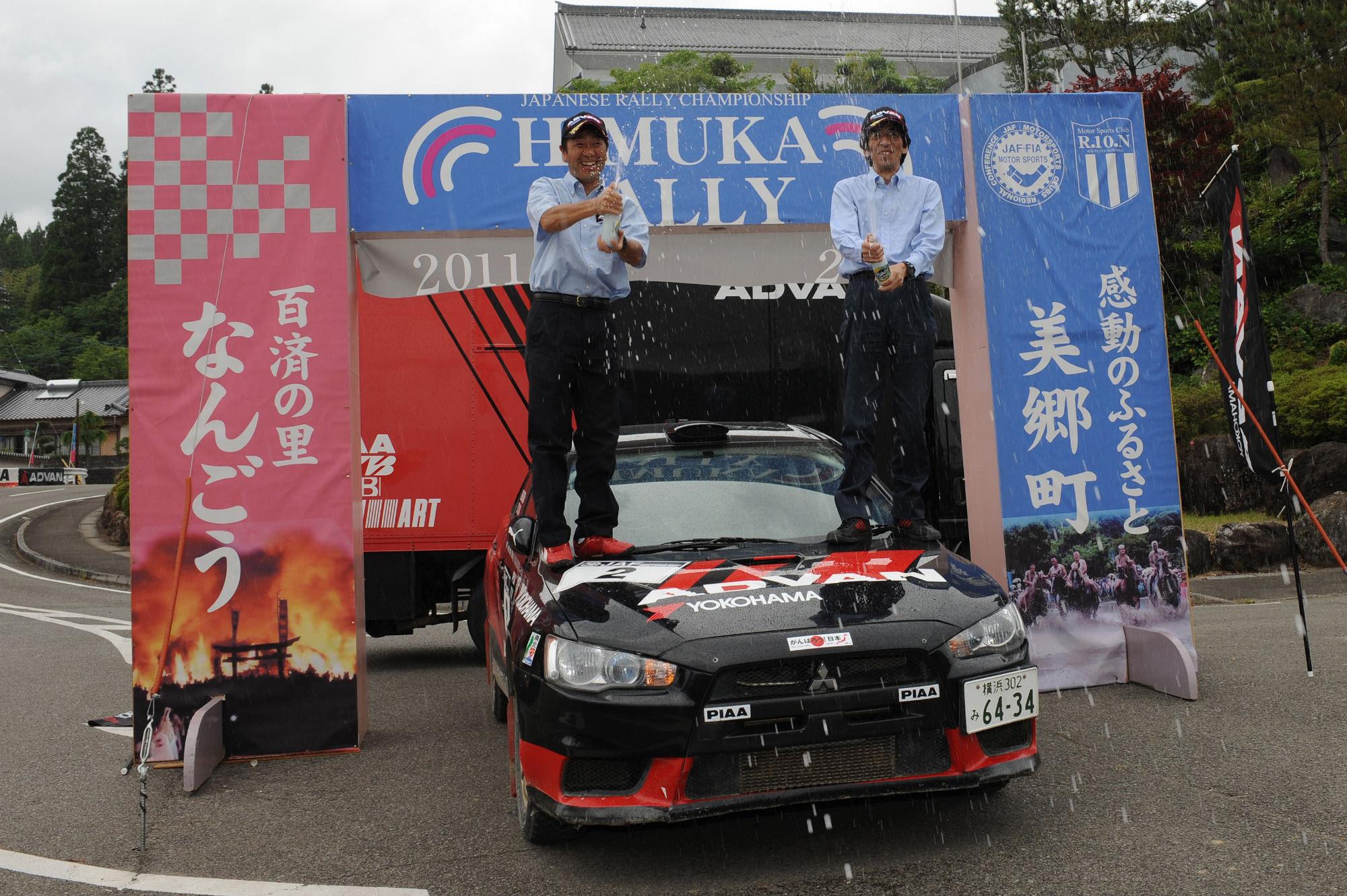 香川と曽根の対決は、デイ2オープニングのSS8で決着がついた。「抑えて走ったつもりなのに、SS中にいきなりサスペンションが壊れた……」と、サスペンションアームを破損した香川がストップ。労せず曽根がトップに立った。その後は一時的に松原が曽根とのタイム差を12秒詰めてくるものの、クラッチトラブルは解消せずにジリジリと引き離されていく。結局、2009年まで3連覇を挙げた相性の良いひむかで、曽根がトップを守りきり今季初勝利を獲得した。2位には松原、3位には「セクション1でアライメントが狂っていてタイムが伸びなかった」という山口清司AE111レビンが、サービスでアライメントを調整した後のセクション2からジワジワと順位を上げ入賞した。